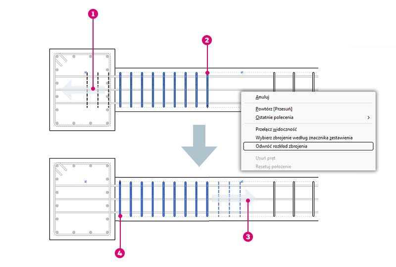 Aby wybrać kierunek rozwinięcia rozkładu zbrojenia, użyj opcji odwracania w menu kontekstowym.