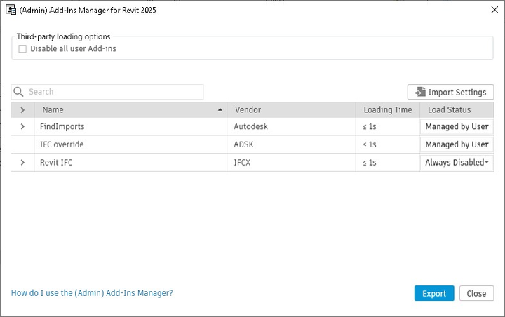 Pobierz i zainstaluj narzędzie Menedżer dodatków (Administrator) dla programu Revit i użyj go do skonfigurowania ustawień dla każdego dodatku zainstalowanego na tym samym komputerze, na którym działa Menedżer dodatków (Administrator). Menedżer dodatków (Administrator) ma globalną opcję wyłączenia wczytywania dodatków innych firm.