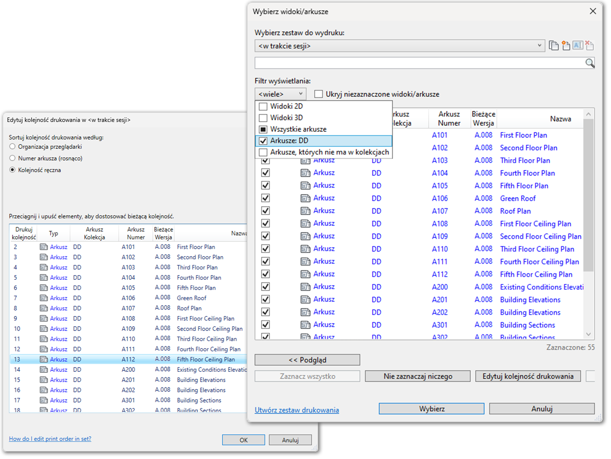 Wybieranie widoków i arkuszy jest łatwiejsze dzięki dodatkowym kolumnom kolekcji arkuszy, numeru arkusza i bieżącej rewizji w oknie dialogowym. Eksport plików PDF został ulepszony, dzięki czemu jest szybszy i dokładniejszy.