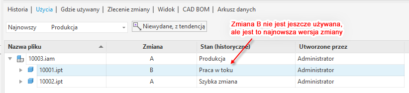 na karcie Użycia wyświetlana jest najnowsza wersja pliku. Pokazuje bieżący etap wszystkich komponentów/komponentów podrzędnych.