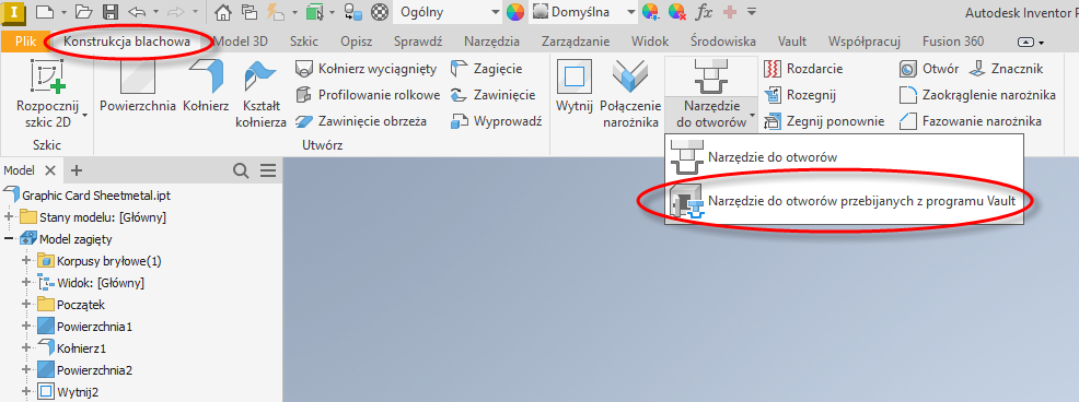 Na wstążce kliknij kartę Konstrukcja blachowa > Narzędzie do otworów przebijanych i wybierz opcję Narzędzie do otworów przebijanych z programu Vault.