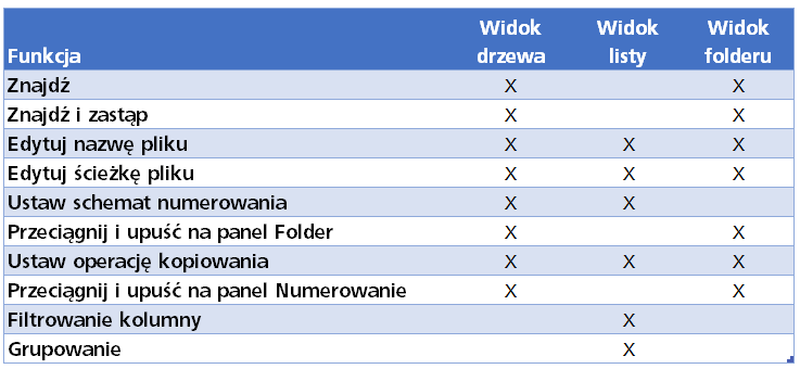 Foldery | Panel Foldery umożliwia przeglądanie folderów źródłowych i docelowych dla operacji kopiowania projektu. Jest to dobry sposób, aby upewnić się, że potrzebne pliki są wybrane i zostaną skopiowane do prawidłowego położenia. Wybrane pliki można grupować do wykonania operacji na podstawie położenia folderu. Można także przeciągać i upuszczać pliki pomiędzy folderami lub z siatki głównej, aby wykonać kopię. Aby uzyskać więcej informacji, zobacz temat Panel Foldery. |