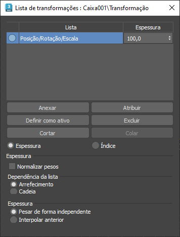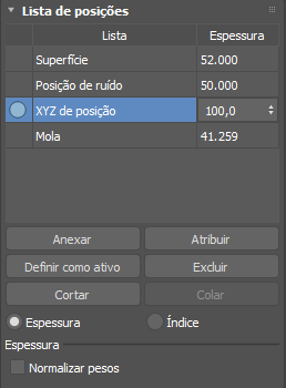 Por padrão, a configuração de Espessura de cada controlador listado é definida como 100.0. Esta configuração pode ser alterada para aumentar ou diminuir o efeito do controlador sobre um objeto.