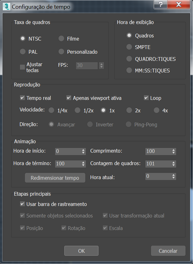 A caixa de diálogo Configuração de tempo fornece configurações para taxa de quadros, hora de exibição, reprodução e animação. Use essa caixa de diálogo para alterar o comprimento, esticar ou redimensionar a animação. Também é possível usá-la para definir os quadros inicial e final do