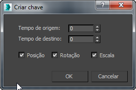 Você pode utilizar o controle deslizante de tempo para criar teclas de transformação ao copiar valores de transformação de um tempo para outro. Para especificar o tipo de tecla a criar e o tempo de origem e o destino para os valores de tecla, clique com o botão direito do mouse o deslizador de tempo para exibir a caixa de diálogo Criar tecla.