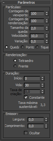 - Escolha como partículas são exibidas em viewports. A configuração de exibição não afeta a forma como as partículas são renderizadas. Gotas são riscos mostrados como gotas de chuva e os marcadores são pequenos sinais de mais.
