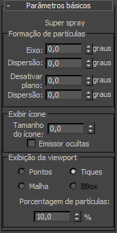 O ícone aparece como um círculo e um plano de interseção com uma seta. A direção inicial do spray (baseado na orientação do ícone emissor e indicado pelo ícone de seta) depende da viewport na qual criar o ícone. Geralmente, o spray das partículas é dado na sua direção quando criado em uma viewport ortográfica, ou o spray sai para cima quando criado em uma viewport em perspectiva.