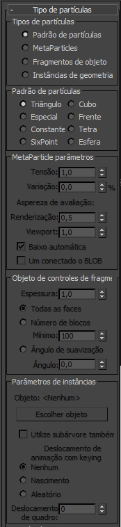 Estas opções especificam uma das quatro categorias do tipo de partícula. Dependendo da opção que você escolher, controles diferentes controla se tornam disponíveis na parte inferior da implementalçai do Tipo de Partícula.