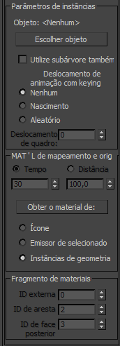 Essas opções são utilizadas quando você especifica as Exemplificações da Geometria no grupo Tipos de Partícula. Elas permitem gerar cada partícula como uma exemplificação de um objeto, hierarquia vinculada dos objetos, ou um grupo.