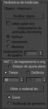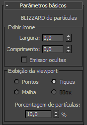 Esta seção descreve o grupo do Ícone de Exibição na implementação dos Parâmetros Básicos, o grupo de Movimento de Partículas na implementação de Geração de Partículas e o grupo de Fonte e Mapeamento de Material na implementação do Tipo de Partículas. Estes são os únicos controles exclusivos de Nevasca. As outras implementações de Nevasca e seus conteúdos são idênticos aos da Matriz de Partículas, exceto que os Fragmentos de Objeto e configurações associadas não estão disponíveis na implementação do Tipo de Partículas. Consulte PArray para obter mais detalhes ou escolha a partir da lista seguinte para obter informações sobre a implementação.