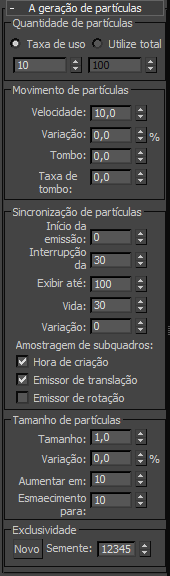 Você define os parâmetros do emissor na implementação dos Parâmetros Básicos do sistema de partículas, no grupo do Ícone de Exibição.