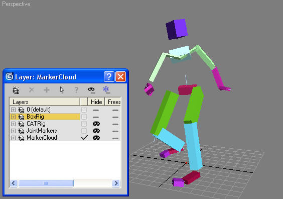A segunda camada é o BoxRig que define os ângulos da junta. As caixas são restritas às posições da junta e os controladores LookAt definem as rotações. Observe que a posição exata de muitos ossos não é importante. Por exemplo, as juntas de joelho se movem em relação ao osso do quadril, mas quando esses dados são mapeados para o CATRig, o último sistema de cinemática direta limpa efetivamente o movimento e bloqueia as localizações da junta.