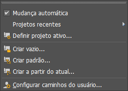 Para definir a pasta de projeto, selecione uma das opções do submenu Projeto, ou o botão correspondente na barra de ferramentas Projeto.