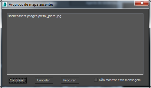 - Somente aparece no momento da renderização. Quando ativada, o 3ds Max não exibe a caixa de diálogo na próxima vez que os arquivos externos não forem encontrados.