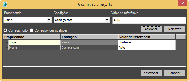 Por exemplo, se você definir Propriedade = Nome, será possível escolher Condição = Contém cadeia de caracteres para que seja possível pesquisar uma cadeia de caracteres de texto em qualquer lugar nos nomes de objeto.