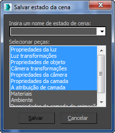 Lista as partes que podem ser salvas no estado de cena. Por padrão, todas as partes são realçadas, exceto Materiais e Ambiente. Ao escolher um conjunto de seleção diferente, ele é “persistente”, o que significa que na próxima vez que a caixa de diálogo for exibida, as partes realçadas anteriormente estarão realçadas.
