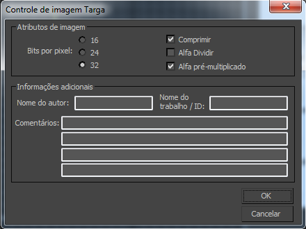 Clicar em Renderizar ou Configuração na caixa de diálogo Arquivo de saída de renderização exibe a caixa de diálogo Controle de Imagem Targa.