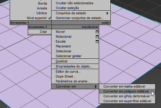 Converter para polígono editável. Como alternativa, aplique o modificador Editar polígono.