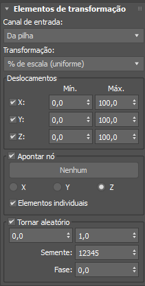 Esse operador exige uma seleção de vértice existente antes de poder afetar qualquer elemento na malha. Quando o operador Elementos de transformação não parece estar fazendo nada, muito vezes isso se deve à ausência de uma seleção na qual operar. Você pode fornecer uma seleção de vértice com uma seleção suave manual (por exemplo, usando Editar polilinha) ou com a pilha de operadores (por exemplo, usando um operador de Influência do nó).