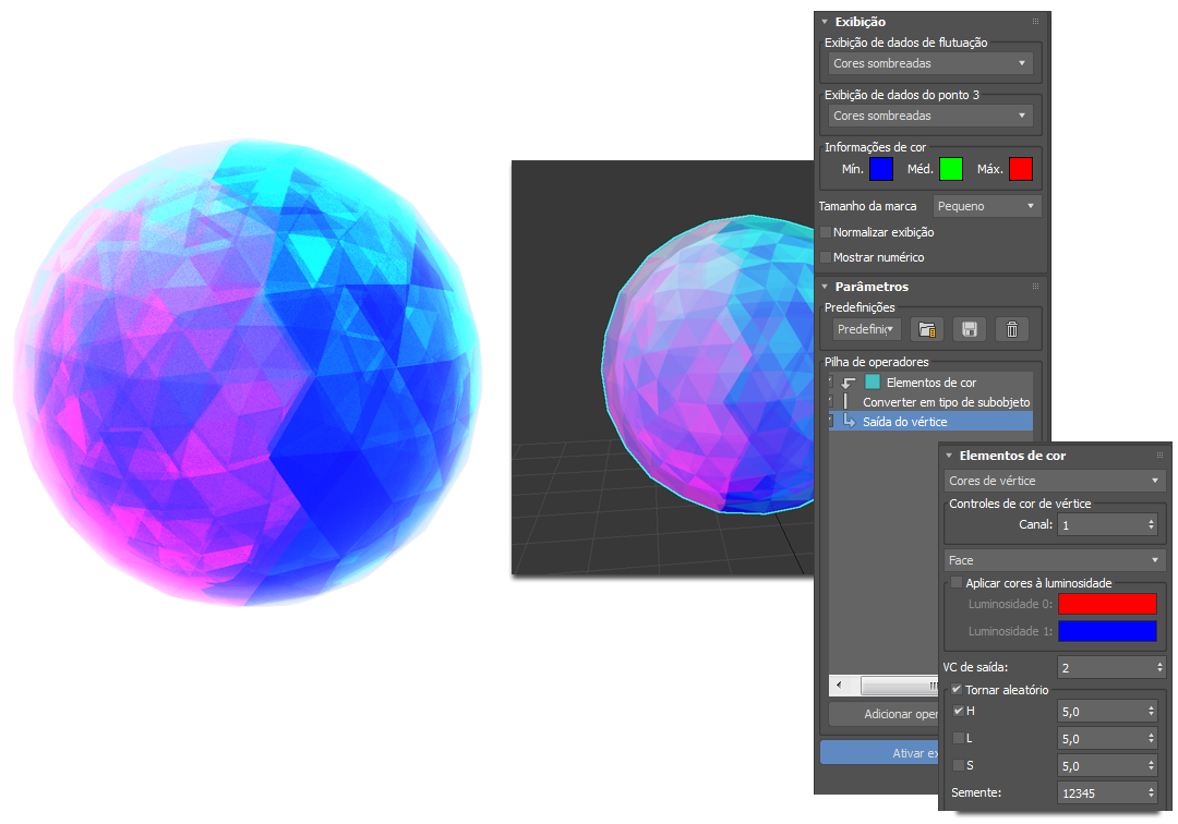 O operador Elementos de cor colore aleatoriamente cada face de uma Geosfera ao determinar a base e a transparência do material usando a saída de cor de vértice.