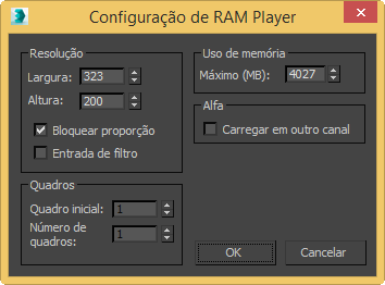 A caixa de diálogo Configuração do RAM Player contém controles para a resolução, quadro, uso de memória e canal alfa para reproduzir animações.