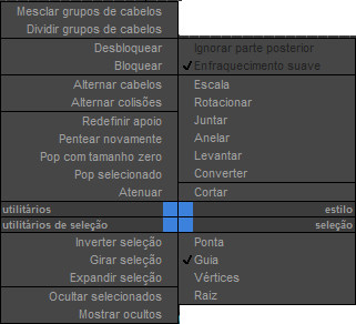 Enquanto está modelando cabelo no nível de subobjeto Guias, clicar com o botão direito do mouse em uma viewport exibe um menu quad que contém atalhos para muito controles de modelagem que também são encontrados na implementação Penteado.