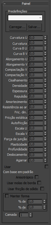 Salve os parâmetros de Propriedades do tecido em um arquivo a ser carregado em um momento posterior. Por padrão, os arquivos de predefinição de tecido são salvos na pasta \tecido no diretório de instalação do 3ds Max.