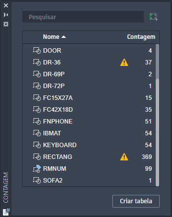 Nota: Somente os blocos visíveis no espaço do modelo são exibidos na paleta Contagem.