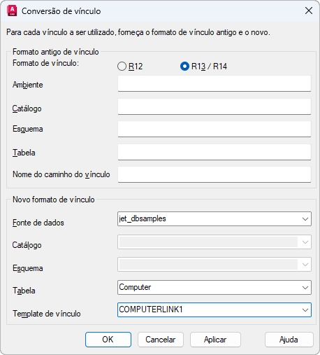 Em Tabela, insira o nome da tabela do banco de dados do Versão 13 ou Versão 14 para o vínculo que deseja converter.