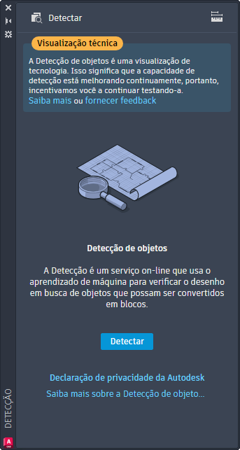 A paleta Detecção fornece opções para analisar o desenho e revisar os objetos identificados para conversão de bloco.
