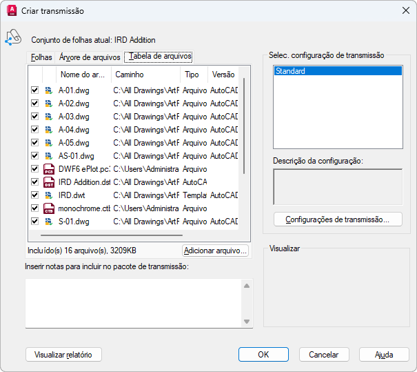 Por padrão, todos os arquivos associados ao desenho atual (como refex, estilos de plotagem e fontes relacionados) são apresentados. Você pode adicionar arquivos ao pacote de transmissão ou remover arquivos existentes. Os arquivos relacionados que são mencionados pelos URLs não são incluídos no pacote de transmissão.