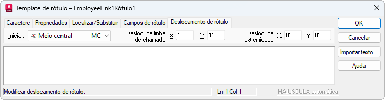 Especifica um deslocamento X e Y do objeto texto de múltiplas linhas em relação ao objeto de linha de chamada associado. Por padrão, as opções X e Y de Deslocamento da linha de chamada, são definidas como 1, indicando que o texto da legenda está deslocado 1 unidade nos planos X e Y a partir do final do objeto de linha de chamada. As configurações de Deslocamento da linha de chamada somente se aplicam a legendas anexadas.