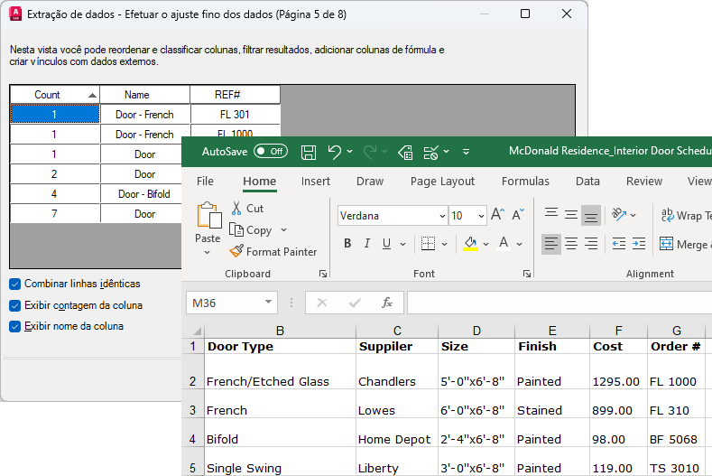 As informações armazenadas na planilha do Excel podem ser vinculadas e combinadas com os dados de desenho extraídos (dados de propriedades do objeto). Dando continuidade ao exemplo acima, você tem algumas informações adicionais sobre as portas no desenho em uma planilha Excel (fornecedor e custo). Selecione estas colunas referentes a fornecedores e custos da planilha e combine-as com outros dados na extração de dados.