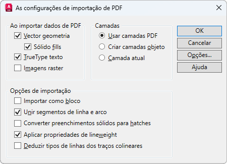 Define as opções para a importação de geometria, preenchimentos, imagens de raster e objetos de texto TrueType a partir de um arquivo PDF especificado.