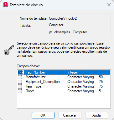 Exibe todos os campos disponíveis para a tabela de banco de dados atual, bem como o tipo de campo e, no caso de campos de caractere, o tamanho do campo. Os campos-chave do template de vínculo são especificados por meio da seleção da caixa de seleção à esquerda do nome do campo.