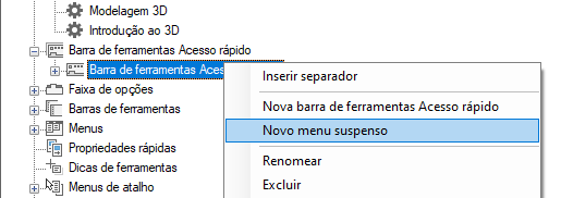 - Na guia Personalizar, no painel Personalizações em <nome do arquivo>, clique com o botão direito do mouse no nó Barras de ferramentas de acesso rápido. Clique em Nova barra de ferramentas de acesso rápido.