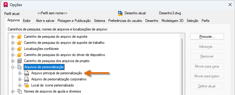 As alterações feitas no perfil de usuário são armazenadas no Registro do Windows e são migradas. Nota: Não está disponível no AutoCAD LT.