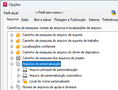 - Na caixa de diálogo Opções, guia Arquivos, clique no sinal de mais (+) ao lado de Arquivos de personalização, para expandir o nó.