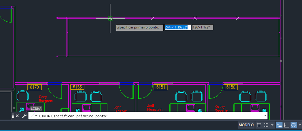 Suponha que desejamos adicionar paredes para criar cinco cubículos de escritório no espaço vazio entre essas paredes. Para recriar este exercício para você mesmo, é possível usar o desenho de amostra Floor Plan Sample.DWG e excluir cubículos de 6156 a 6162 ou criar um novo desenho e simplesmente desenhar um retângulo de forma similar para representar as paredes do escritório.