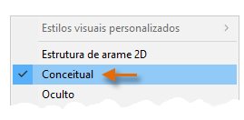 O menu [Estrutura de arame 2D] inclui uma lista de estilos visuais disponíveis.
