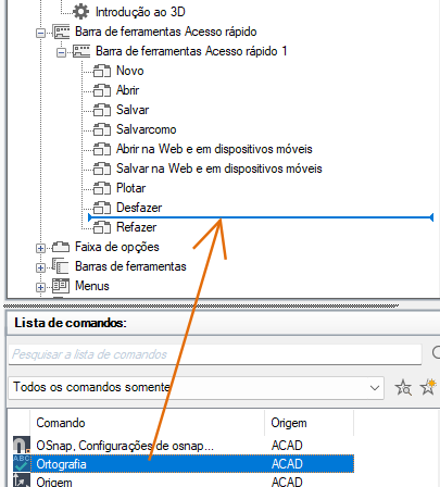- No painel Lista de comandos, arraste o comando ou o controle que deseja adicionar à barra de ferramentas de acesso rápido no painel Personalizações em <nome do arquivo>.