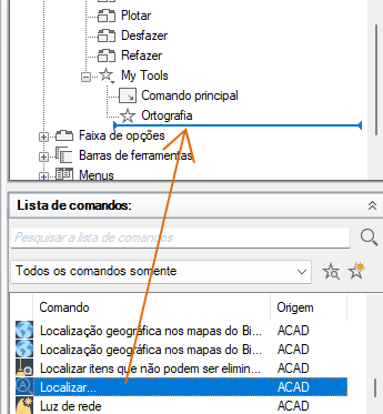 - No painel Lista de comandos, arraste o comando ou o controle que deseja adicionar ao menu suspenso no painel Personalizações em nome do arquivo>.