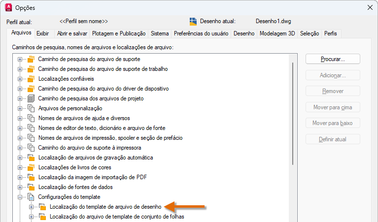 Os arquivos de modelo de desenho (DWT) são usados para criar novos desenhos. Os desenhos criados com um arquivo DWT contêm todos os estilos e objetos de desenho definidos no arquivo DWT. Os arquivos DWT personalizados da versão anterior são migrados para uma subpasta com o nome da versão para a qual eles foram migrados; a convenção de nomenclatura da subpasta é Modelos Nome do produto. A subpasta Modelos Nome do produto é criada na pasta definida pela configuração Localização do arquivo de modelo do desenho.