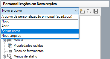 Todos os novos comandos criados são adicionados diretamente no arquivo CUIx de trabalho. Se o arquivo CUIx em que deseja trabalhar não está carregado, selecione Abrir a partir da lista suspensa Arquivos de personalização. A seguir, procure e selecione o arquivo CUIx com o qual deseja trabalhar.
