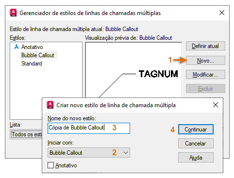 No Gerenciador de estilos de linha de chamada múltipla, clique em Novo (1) e digite Chamada de detalhe em bolha como novo nome de estilo (2) e clique em Continuar (3).
