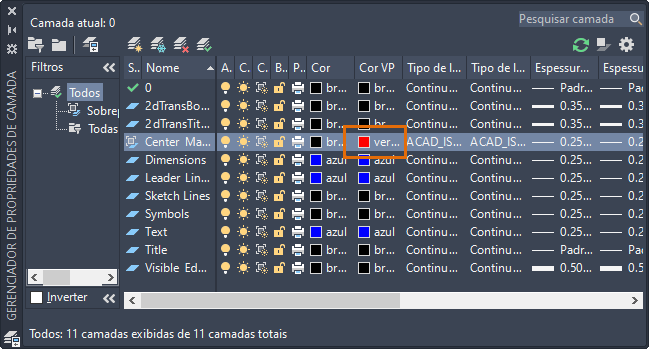 Altere a cor da camada Marca de centro para vermelho. Para garantir que a alteração de cor seja somente para esta viewport, selecione a cor na coluna Cor da VP.