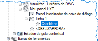 No painel Lista de comandos, na caixa de texto Pesquisar a lista de comandos, digite bloco. Selecione Criar bloco (comando BLOCO) e arraste-o para a Linha 1 abaixo de Meu painel HYT.
