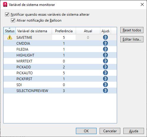 No prompt de comando, insira MONITORVARSISTEMA. Na caixa de diálogo Monitoramento de variáveis de sistema, é possível ver as variáveis de sistema que estão sendo monitoradas atualmente.