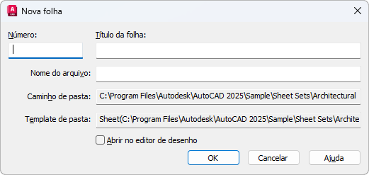 Especifica o número da folha. É recomendável não preencher o número da folha ao criar uma folha pela primeira vez. Por padrão, o nome do desenho e o nome do layout da nova folha serão o número da folha junto com o título da folha.