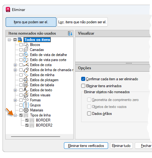 Use a caixa de diálogo Eliminar para excluir as definições não referenciadas, incluindo os tipos de linha, do desenho atual.